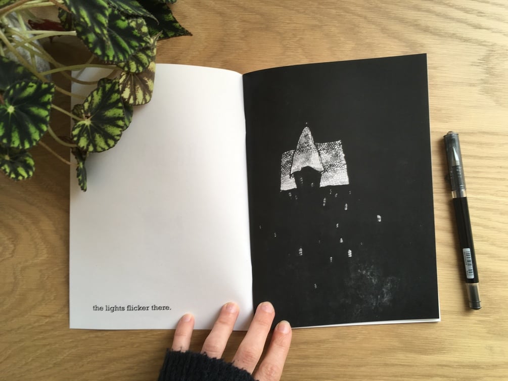 This is a downloadable PDF of a visual poetry zine, where words and images form a haunting atmosphere of dark houses, whispered secrets and flickering lights. With a minimalist and poetic feel, the original illustrations were made with black Holbein drawing ink.